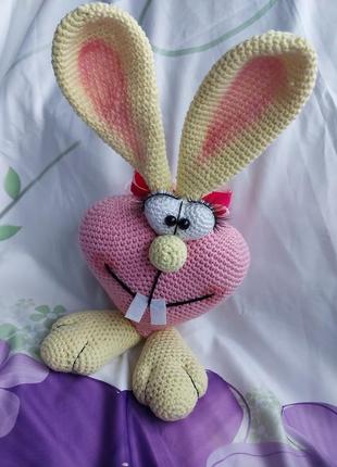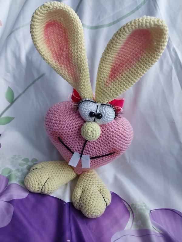 Валентинка-зайчик,размер 25 см с учетом ушек,нить джинс, наполнитель холлофайбер.
