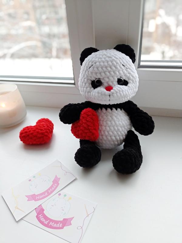 Плюшева панда. Изготовлена из гипоаллергенной плюшевой пряжи, наполнитель холлофайбер, фурнитура на безопасном креплении. Рост ее 21-22см. Возможен повтор с вашими пожеланиями