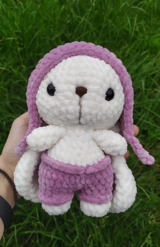 Зайчик в шапочці та шортах, чудовий подарунок на будь-яке свято) М'якенький та приємний на дотик Зроблений з гіпоалергенних матеріалів Плюшева пряжа Очі на безпечному кріпленні Наповнювач холлофайбер Висота іграшки 17-18 см