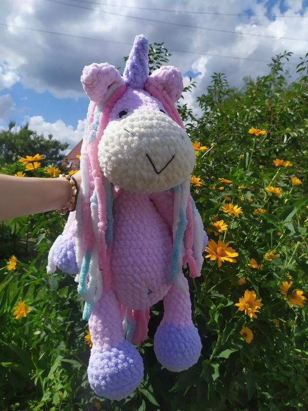 Великий в'язаний єдиноріг, стане чудовим подарунком для дитини) Зроблений з гіпоалергенних матеріалів Наповнювач холлофайбер Очі з блискітками на безпечному кріпленні Іграшка м'якенька та приємна на дотик, з волосся можна плести косички) Висота іграшки: 60-63см Ціна 1900 грн