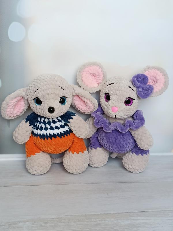 Маленькі мишенята зростом 19 см. Зв'язані з гіпоалергенної плюшевої пряжі, очі і носик на безпечному кріпленні, наповнювач-холофайбер.