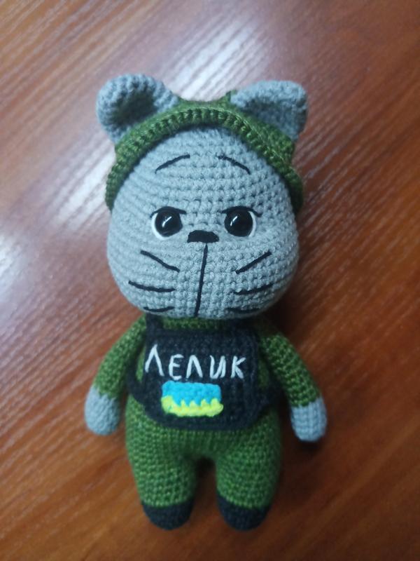 М'який котик ЗСУ, нитки акрилові, наповнення холофайбер гіпоалергений, очі на безпечному кріпленні. колір на ваш вибір, напис також.