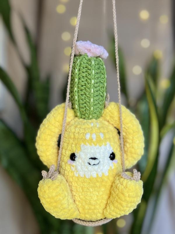 Игрушка ручной работы желтый ленивец с кактусом из плюшевых нитей