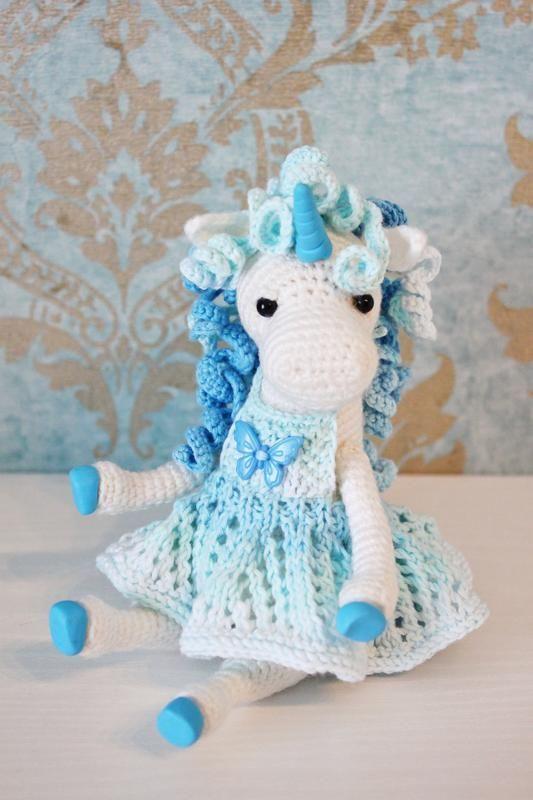 Вязаная игрушка единорог нежно-голубого цвета в сарафанчике в подарок для девочки.