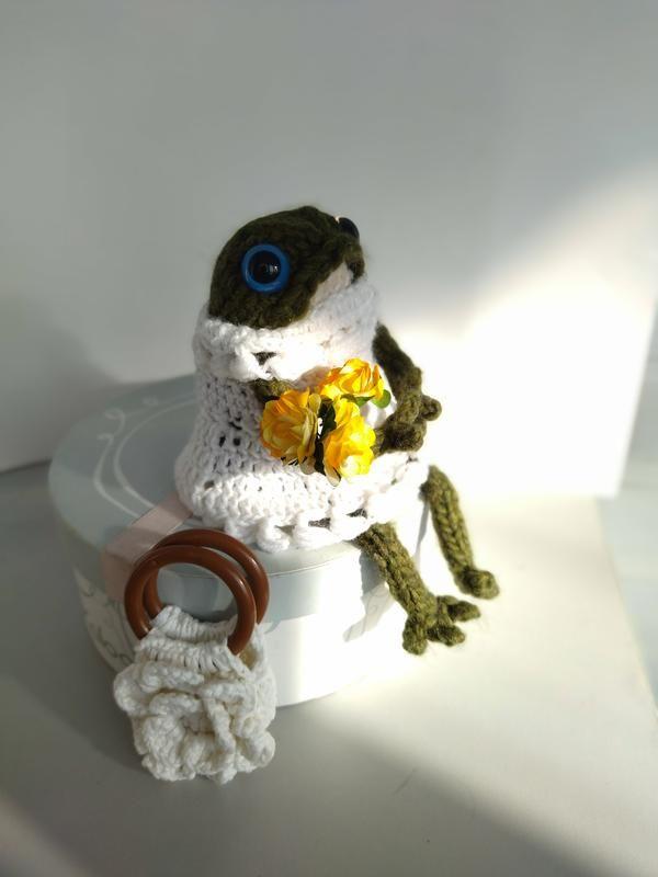 Лягушка вязанная в белом платье, бирете и с сумкой- цветком. Мягкая игрушка. Гипоалергенные материалы. Глаза на безопасном креплении. Рост 22см
