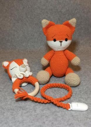 Найкращій подарунковий набір для новонародженого та його мами! Екологічні та якісні матеріали, в′язана фактура сприяє розвитку дрібної моторики. Лисичка зростом 20 см, брязкальце, тримач для пустушки з пластиковою кліпсою. Матеріали: пряжа - бавовна та поліакріл (гіпоалергена), дерев′яне кільце d = 6 см - клен, наповнювач - холлофайбер, очка - на безпечному кріпленні.