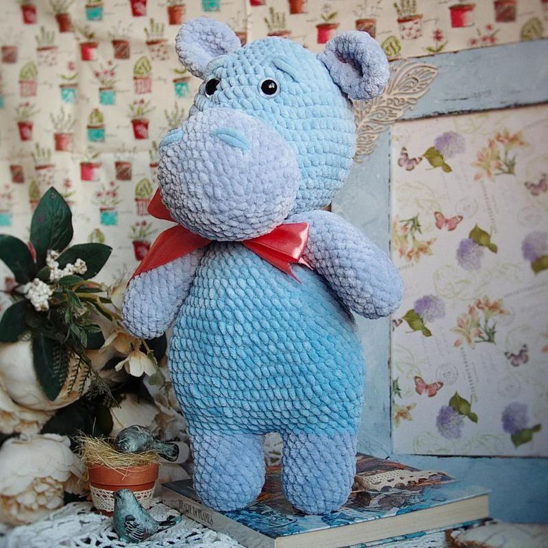 Милий бегемот подарує вашій дитині емоції і щасливі спогади дитинства Малюк ну дуже м'який і приємний на дотик, наповнювач синтепон. Оченята на безпечному кріпленні. Матеріал - дитяча плюшева пряжа Зростання малюка 34 см Товар виготовляється на замовлення