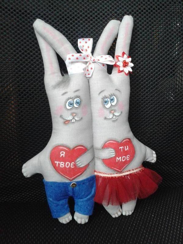 Пара очаровательных голубоглазых зайцев из бязи украся дом, наполненный любовью. Зайки оделись для прогулки под цвет глазок в фетровые штанишки и кокетливую фатиновую юбочку с кружевами. Одежда не снимается. Рост 25 см с ушками Авторская роспись акриловыми красками. Есть подвеска. Замечательная идея для подарка влюблённой паре, например на первую годовщину свадьбы – Ситцевую. Могу дополнить пожеланием на спинках или открыткой и нарядно упаковать. Можно развить историю и добавить маленького зайку любого пола за 50 грн. Полное повторение невозможно. Живут в единственном экземпляре. Дополнительные характеристики: Вид : Зайчик