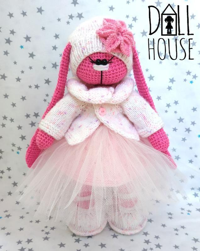 Материалы: полушерстяное пряжа, акриловая пряжа, наполнитель холофайбер, пластиковые пуговицы, фатин. Размер: 33 см. Вязаная зайка тильда станет незабываемым подарком! Вся одежда снимается: трусики, платье, юбка из фатина, кофта, шапочка, сапожки. Ножки и ручки подвижны, стоит самостоятельно.