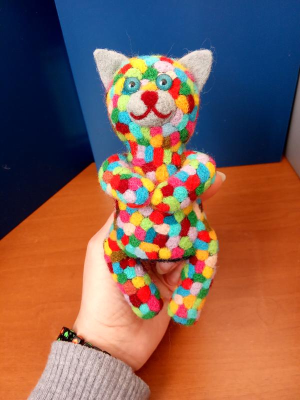 Котик выполнен из высококачественной шерсти методом сухого валяния. Кто бывал в Вене и посещал Дом Хундервассера, оценит разноцветное настроение изделия. Будет отличным подарком и украшением интерьера. Выполнен в одном экземпляре. Высота 16см.