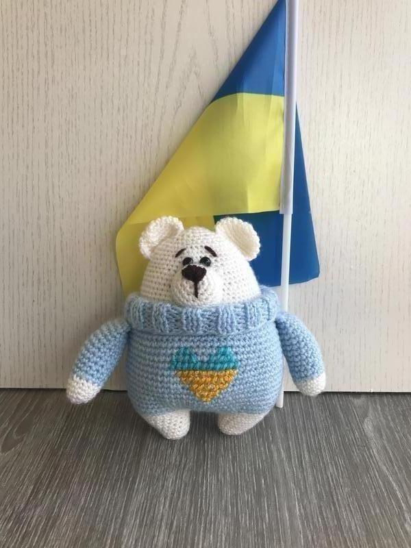 Прекрасный патриотичный мишка в свитере. Станет хорошим подарком для Вас и Ваших родных. Нитки- гипоаллергеный акрил. Глазки приклеены. Наполнитель - холофайбер 100% ручная работа. Связан с любовью. Дополнительные характеристики: Вид : Мишка