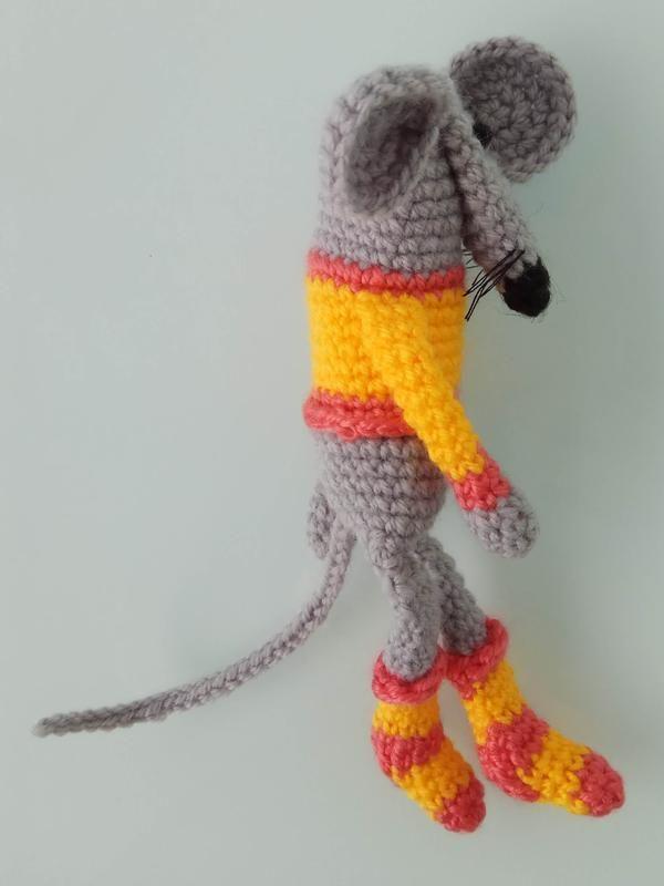 Длина игрушки с ножками – 17 см., сидя – 9 см. Связана из акрила. Глаза – вышиты. Усы из ниток. Одежда не снимается. Самостоятельно сидит только если отвести назад одну или обе ручки.