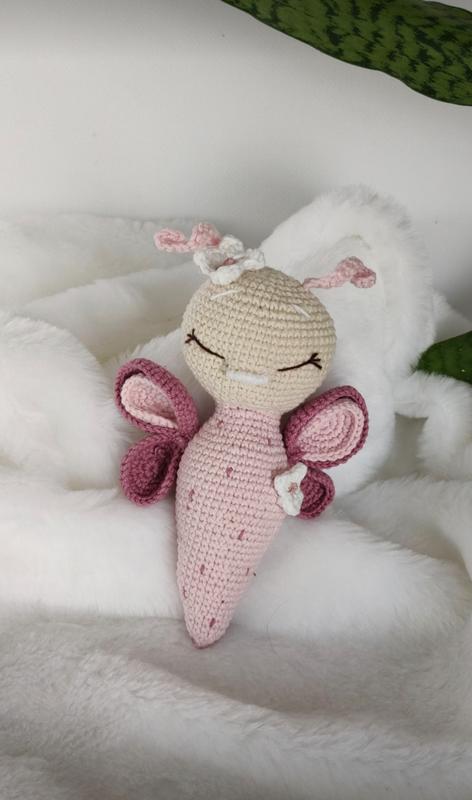 Брязкальце - гризунець метелик відмінний подарунок для немовлят, подарунок на хрестини, подарунок для молодої мами, подарунок на виписку. Веселі брязкальця - перші іграшки вашого малюка. ❖ Завдяки в′язаній текстурі у малюка будуть розвиватися тактильні відчуття, дрібна моторика. ❖ Брязкальце видає приємний звук, розвиває зір і слух ❖ розмір -18 см ❖ пряжа - напівбавовна ❖наповнювач - холлофайбер ❖ в середині іграшки - капсула з намистинками