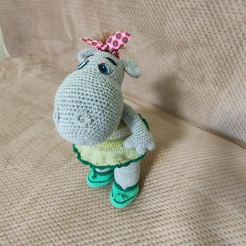 Бегемотик девочка модница мягкая вязаная игрушка