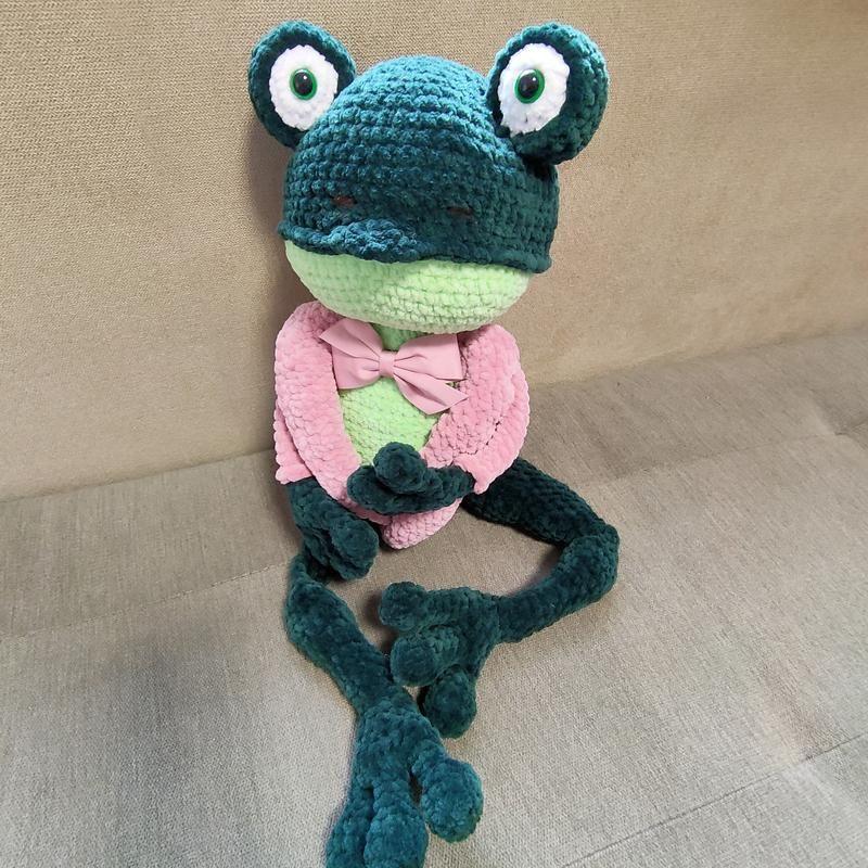 Игрушка лягушка жабка в жакетке зеленая вязаная крючком