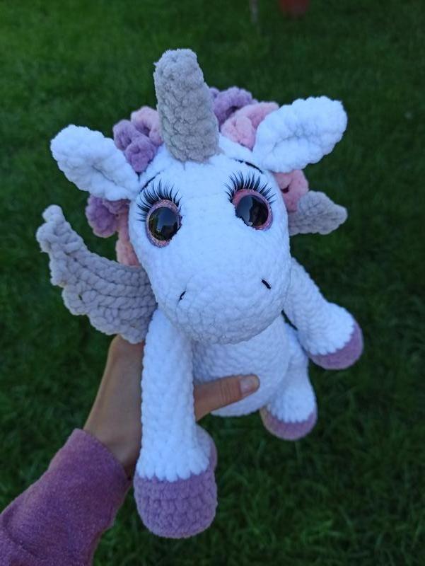 Маршмелоу - крошечный зефирчик в дополнение коллекции единорогов. Особенностью этой девочки есть несколько меньший размер, короткая грива и пара очаровательных крылышек. Нить - мягкий плюш, наполнитель холофайбер, глазки на безопасных для деток креплениях. Высота - 36см с рогом. Дополнительные характеристики: Пол: Для девочек