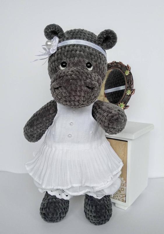Бегемотик зв'язаний гачком. Ручна робота. Амігурумі. Нитки плюш, наповнювач холлофайбер, плаття - коттон. Висота іграшки 27 см Голова/ручки/ніжки рухливі. Сукні/штанці знімні. Подарункова упаковка.