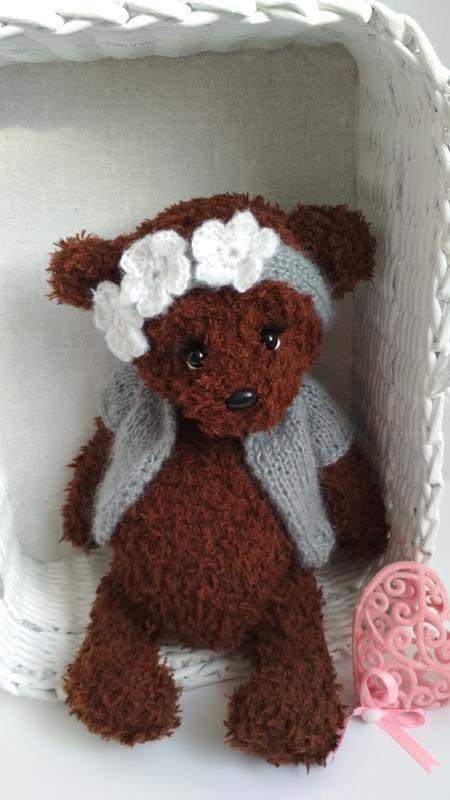 Плюшевая нежная девочка Боня,связана крючком из буклированой пряжи,послужит великолепным украшением для комнаты девочки или девушки, а также для игры ребенку. Съёмные кофточка и повязка связана спицами из мохера. Рост мишки - 29 см, в сидячем положении - 23 см. Нитяное крепление ручек и ножек. Высылаю мишку в оригинальной корзинке, сплетенной вручную.