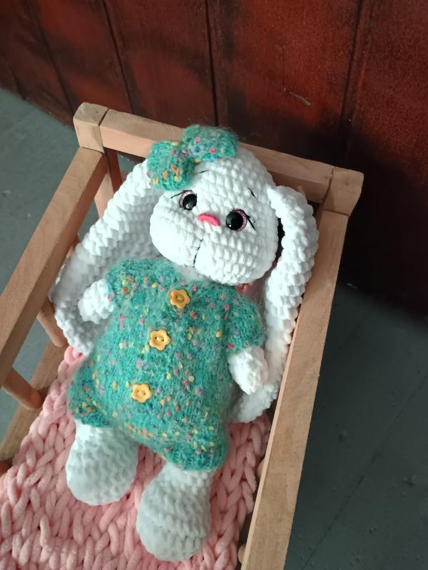 связан из плюшевой пряжи. Наполнитель: гипоаллергенный холлофайбер. Глаза и носик на безопасном креплении, запаянные с середины. Очаровательный белый плюшевый Кролик, созданный, чтобы стать самым нежным другом для Вашего ребенка. Эта игрушка – воплощение качества и уюта, что идеально подходит для подарка на любой праздник или просто так, как проявление любви. ✨ Идеальный размер для объятий: длина кролика составляет 33 см, что делает его комфортным для маленьких ручек, удобным для сна и путешествий. Кролик изготовлен из качественного, гипоаллергенного плюша, который невероятно приятен на ощупь и напоминает нежное облачко. Одет в мягкий полушерстяной комбинезон, он выглядит особенно уютно. Качественный материал комбинезона подчеркивает эксклюзивность изделия. Длинные, элегантные ушки и милый бантик на одном из них добавляют игрушке неповторимый шарм и индивидуальность. Это больше, чем игрушка. Это верный компаньон для ребенка, который принесет тепло, уют и ощущение безопасности в детскую комнату. Выбирайте качество и красоту, которые создают незабываемые моменты!