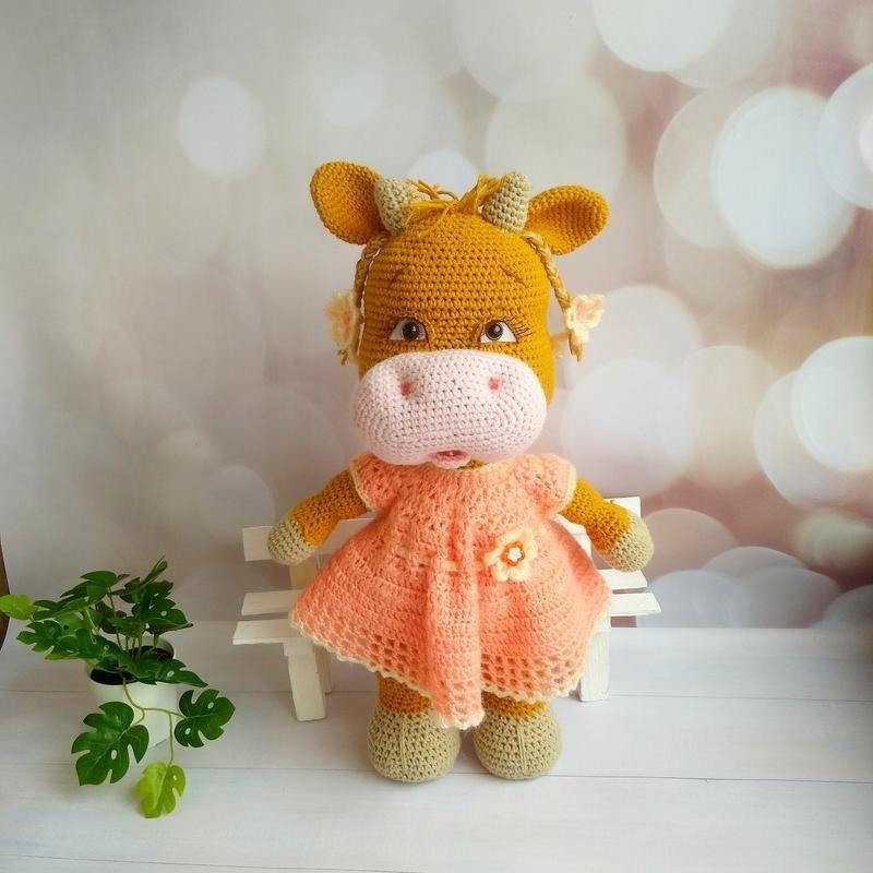 Солнечная коровка. Каркасная игрушка из хлопковой нити,рост 38см.Платье с махерової нити,движущиеся пары ножек.Детки любят одевать игрушки.Платье снимается.Можно стирать в теплой воде,ручная стирка.Хороший подарок,хорошая игрушка. Дополнительные характеристики: Пол: Для девочек Товар под заказ