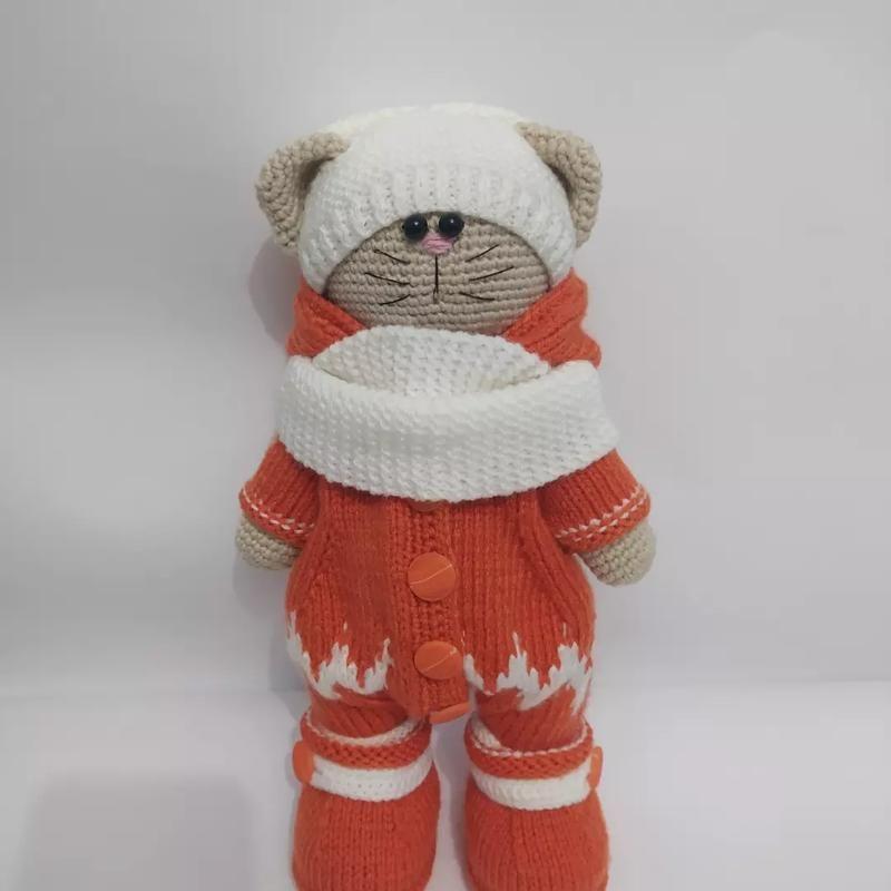 Вязаный котик в зимней одежде. Рост 30 см.