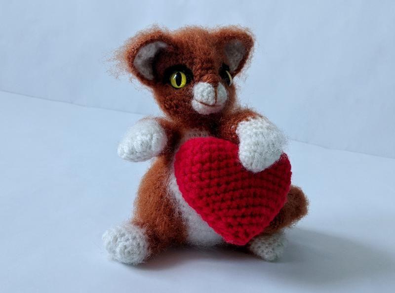 Пушистый котик с сердцем Рыжий котик с белым брюшком. Котик связан из теплой пряжи с ангоркой, набит холлофайбером. Котик очень мягенький, приятный на ощупь. Имеет хороший, немного озорной характер). Сердце – пряжа BABY акриловая. Высота игрушки – 14 см. Прекрасно подойдет для подарка на День святого Валентина.