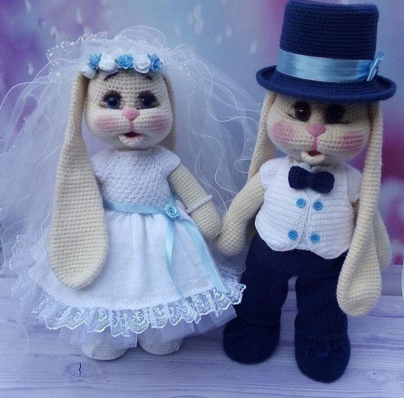 Зайки связаны из полушерти стоят и сидят сами, ручки ножки двигаются на пуговочном креплении, вся одежда снимается, заек можно одевать в различные комплекты одежды, вся одежда что на фото прилагается к зайкам, невеста-рост-45см, жених - 48см,цена жениха зайки-1950грн Дополнительные характеристики: Пол: Для девочек Вид : Зайчик
