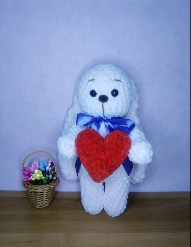 Зайки связаны из плюшевой пряжи наполнитель холофайбер глазки на безопасном креплении стоит с опорой, цена указана за одного,с сердечком+50грн,в наличии тот что слева голубой. Дополнительные характеристики: Пол: Для девочек Вид : Зайчик