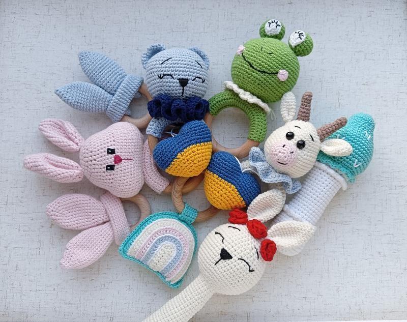 Погремушки выполнены из гипоаллергенных материалов:полухлопковая пряжа, холлофайбер, буковое кольцо Игрушки с фото все в наличии