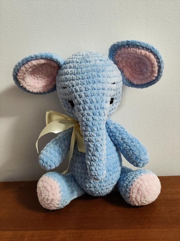Слоненок связан с гипоаллергенной плюшевой пряжи, наполненный холлофайбером. Ручки/ножки двигаются. Размер сидя около 25 см.