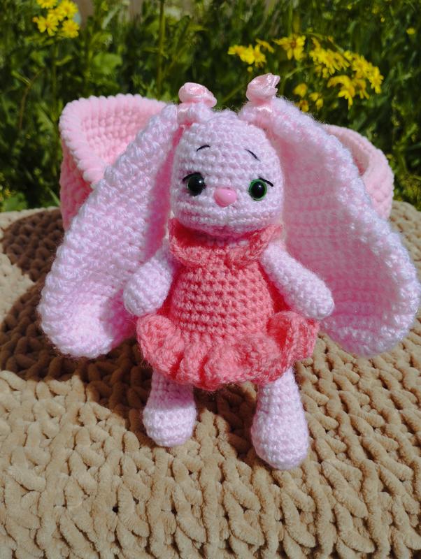 Зв'язана за акрилової пряжі Ковдра та подушка із плюшевої пряжі Наповнювач холофайбер Висота зайчика 15см Висота кроватки 12см Довжина кроватки 18см Ця іграшка буде дуже гарним подарунком для вашої дитини
