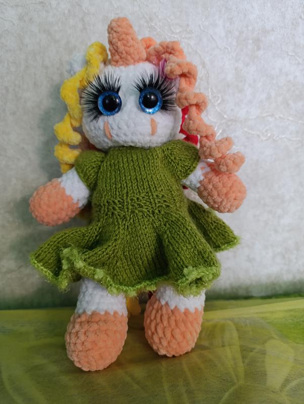 единорожка,вязанная игрушка из плюшевой пряжи, наполнитель холофайбер,глаза на безопасном креплении.рост 27см. платье снимается.