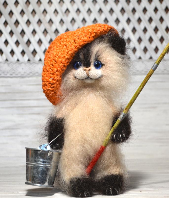 Игрушка создана вручную из экологичных материалов. Натуральная шерсть может нести лечебные функции. Стеклянные глаза, керамический носик. Внутри медный каркас, позволяющий придать игрушке любое желаемое положение в пространстве, лапы, туловище, хвостик - гнутся. В комплекте выдержка, шляпка, удочка. Игрушку можно стирать в прохладной воде с шампунем, сушить на открытом воздухе. Расчесывать шерсть расческой. Не рекомендуется для игры маленьким детям, поскольку содержит мелкие детали и длинный, натуральный шерстяной ворс. Высота игрушки около 22 см