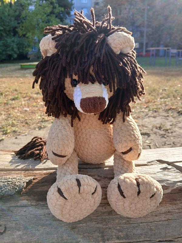 Львёнок связан из плюшевой пряжи. Грива из акриловой пряжи. Наполнитель - холлофайбер. Рост - 36 см.