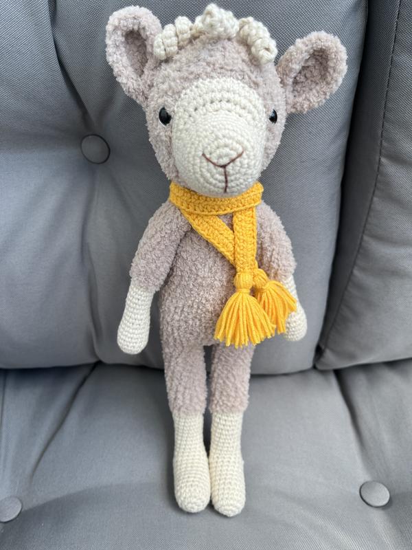 Вʼязана іграшка лама.Мила іграшка як для дитини, дорослого чи для інтерʼєру. Висота іграшки 31-32 см. з вушками. Очі на безпечному кріпленні. Наповнена холофайбером. Шарф змішається. Мʼяка та приємна на дотик. Подарункове упакування.