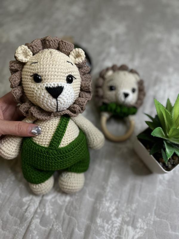 Набір вʼязаний: іграшка лев розімор 15-17см, брязкальце лев 10см (кільце з натурального дерева). На замовлення! Набір може бути у вигляді інших тварин: котик, ведмедик, зайчик та ін. Якщо є питання пишіть у особисті 💌