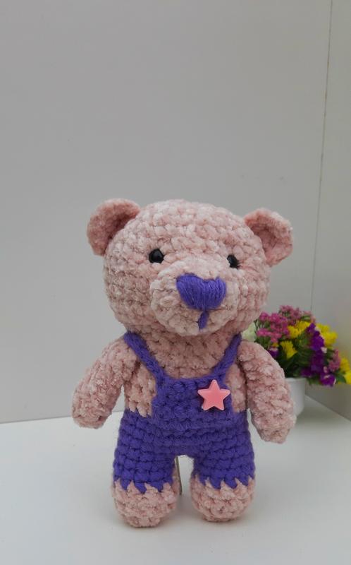 вязаный мысь из плюшевой пряжи, штанишки из хлопковой не снимаются, носик вышит, глазки на безопасном креплении. высотой 15 см.