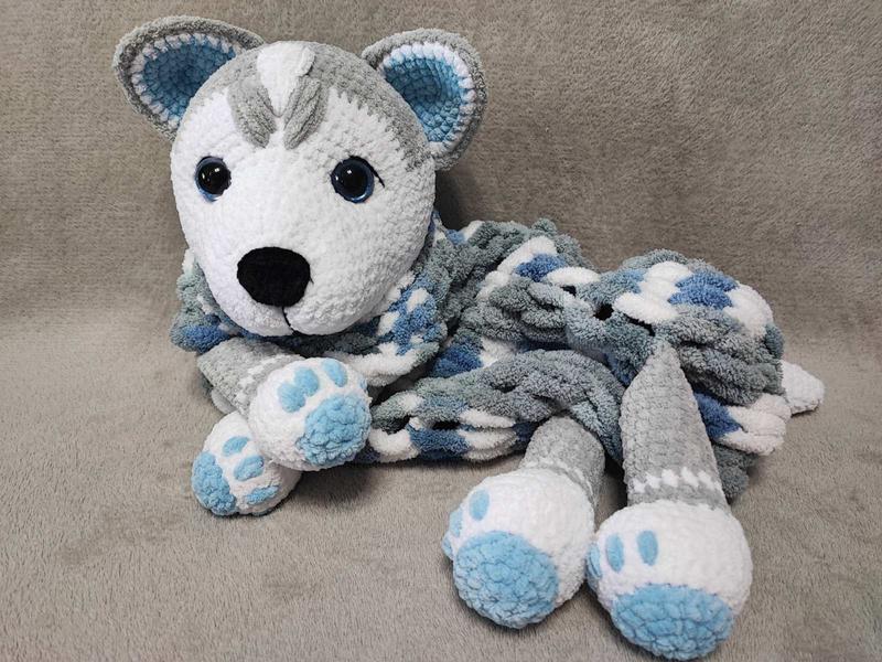 Вязаная пижамница собачка. Пряжа – 100% микрополиэстер, наполнитель – холлофайбер, глазки-винтики на безопасном креплении. Длина от верхушки до задних лапок ( без ушек) 56 см. Пижамницы – это не только мешочек для хранения пижамы, но и игрушка, с которой приятно спать, и украшение детской комнаты. Преимущества пряжи из микрополиэстера: гипоаллергенность, мягкость, быстро высыхает, экологически чистая, сохраняет форму и цвет.