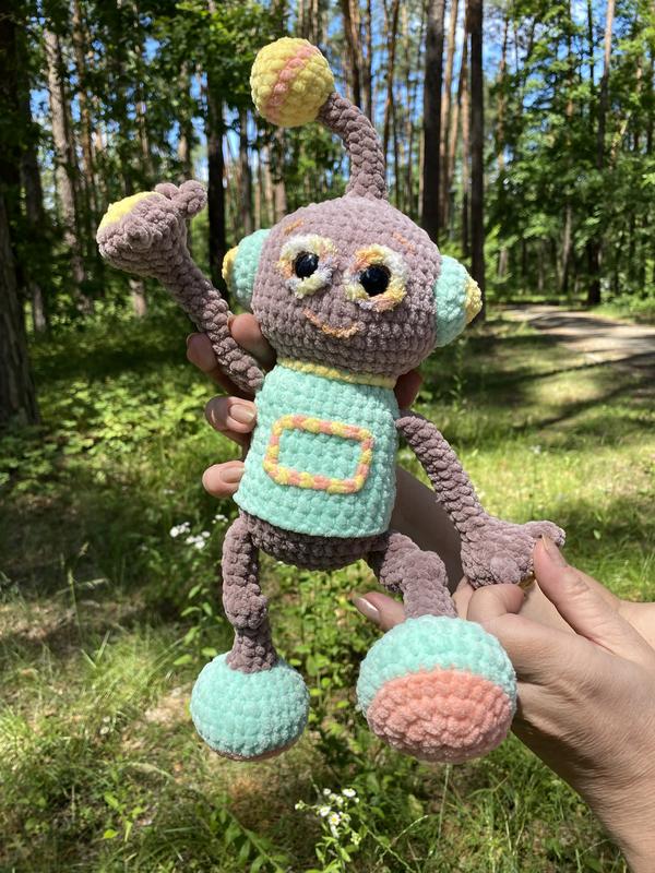 Привет! Я веселый робот, вязаный крючком, ручной работы! * 37 см с антенной * красивые глазки, на надежном креплении * пряжа плюшевая, очень приятная на ощупь * наполнитель холофайбер * руки и ноги мягкие и гибкие, что интересно для детской игры. * в упаковке Робот станет замечательным подарком для мальчика или девочки на любой праздник.