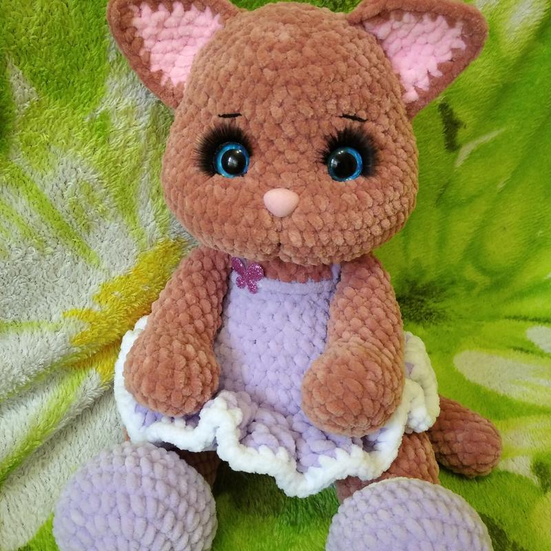 Гарненька киця з плюшевої пряжі мідного кольору зв'язана гачком Пряжа не викликає алергію.Висота красуні 38 см. Оченята на безпечному кріпленні. Наповнювач холофайбер. Іграшка в наявності