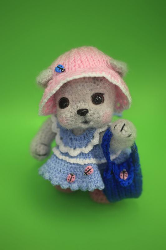 Щеночек девочка связан крючком из мохеровой пряжи. В комплекте платье, шапочка, тапочки и сумочка. Внутри медная проволока, лапки сгибаются. Голова на шплинте поворачивается. Носик и божьи коровки из полимерной глины. Размер щеночка - 15 см. Подарочная упаковка, ручная работа.