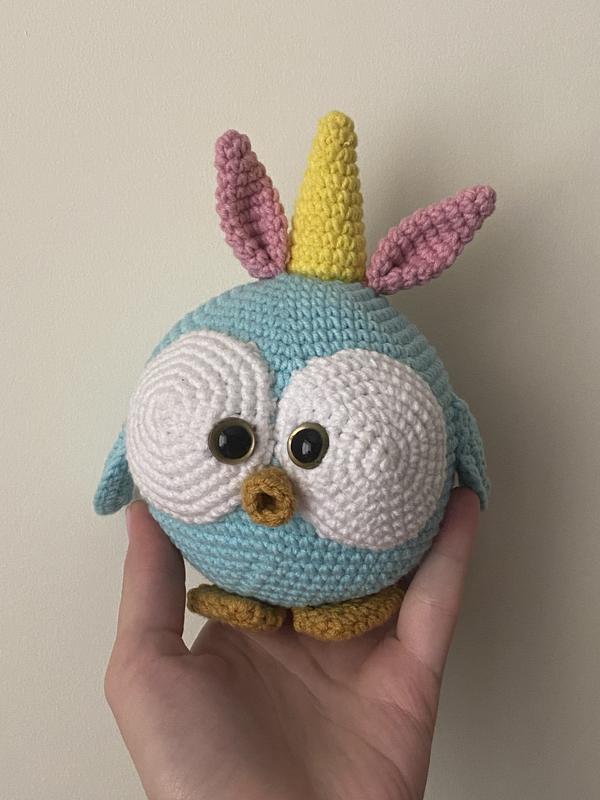 Пташечка-одноріжка😍 Безпечна для малечі. Подарує феєрверк емоцій! Склад: наповнювач холофайбер, ниточка 100% бавовна, очі на безпечному кріпленні. Розмір тіла ширина 10 см, висота 10 см.