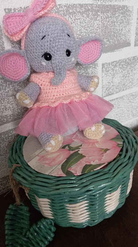Пряжа- турецкий велюр.Приемная на ощупь Рост- 20см.Одяг- платье снимается, повязка тоже. В середине холлофайбер. Глаза на безопасном креплении. В наличии. Положительная слоняша.Гарная игрушка для малышей.