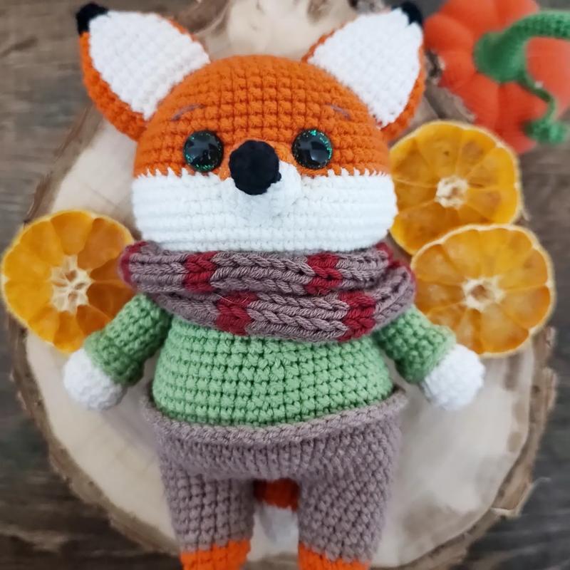 Лис изготовлен из безопасных для детей материалов, таких как хлопковая пряжа и наполнитель из синтетического волокна. Он имеет красивую яркую расцветку, привлекающую внимание. высота: 15 см