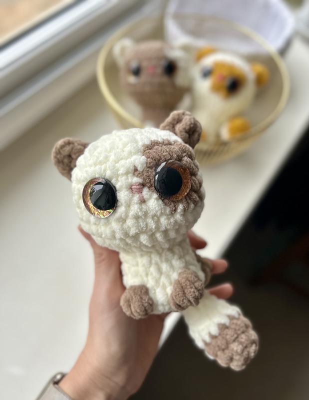 Є багато іграшок та наборів, переходьте у наш профіль🤍 Ціна за одного ✔️ В наявності білий з горчичним та коричневий з білим 🧶Звʼязаний із гіпоалерненної пряжі та наповнювача 👍Безпечне кріплення деталей 💯Ручна робота ♡ зріст котика 13 см ♡ стоїть без опори ♡ величезні блискучі очі на безпечному кріпленні ♡ подарункове пакування безкоштовно