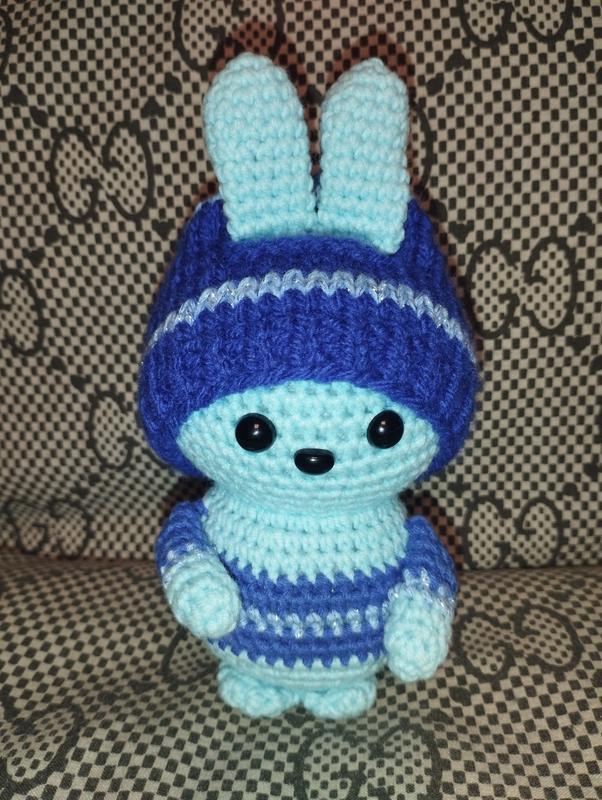 Зв'язана з пряжі напівбавовна Шапочка з пряжі акріл(шапочка знімається) Очі та носик посаджені на клій Наповнювач холофайбер Висота 15см Довжина 8см Ширина 7см