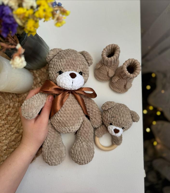 Высота игрушки ≈ 26-28 см. Возможен в разных цветах. Идеальный подарок для младенцев, на день рождения, под елочку, на семью, на крестины, и просто так порадовать близких людей. Цена Мишки - 780 грн. Цена погремушки - 380 грн. Цена пинеток - 450 грн. ( длина стопы пинеток 8 см.)