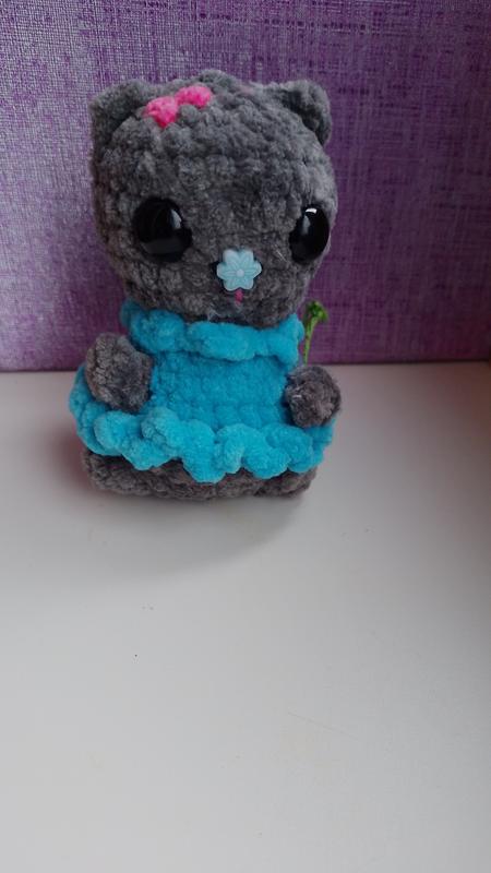Мягкая игрушка кошечка вязаная крючком из плюшевой пряжи