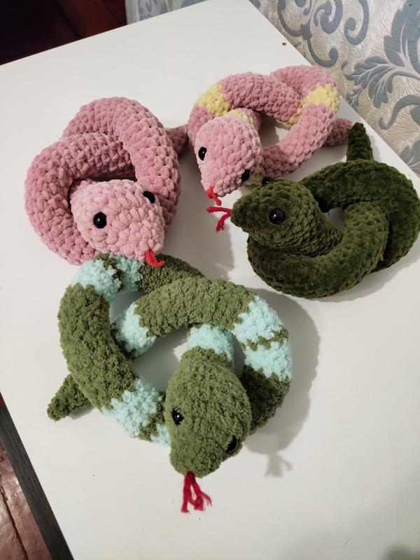 Вязанная игрушка змея. Пряжа плюшевая, глазки на безопасном креплении. Цвета: Розовый Розовый с полосками Зеленый Зеленый с полосками Длинна 70 см