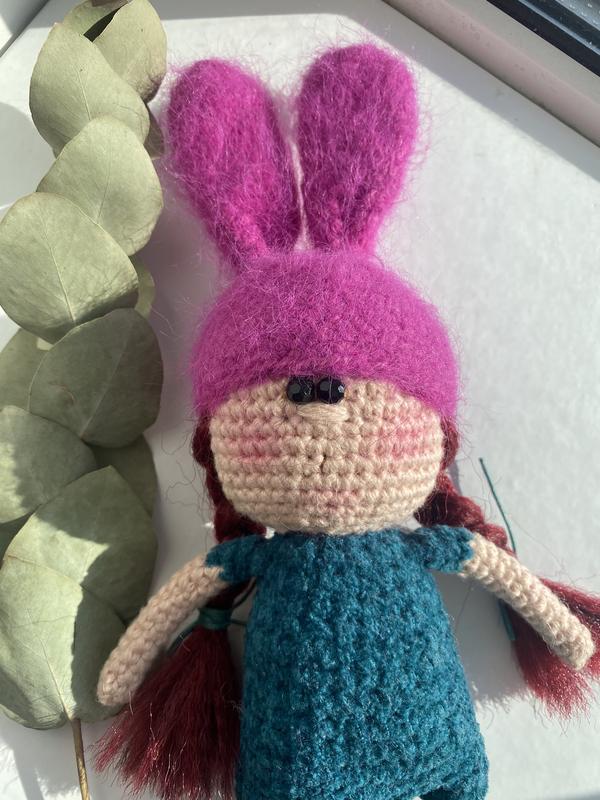Мʼяка вʼязана іграшка дівчинка в шапці зайчика 🐰 Повністю ручна робота. Дуже зворушлива, гарна і яскрава. Виконана з якісних та безпечних матеріалів. Наповнювач - гіпоалергенний холлофайбер. Висота іграшки 25 см. Неповторна і унікальна річ, виготовлена з Душею, яку не купиш у звичайному магазині ❤️